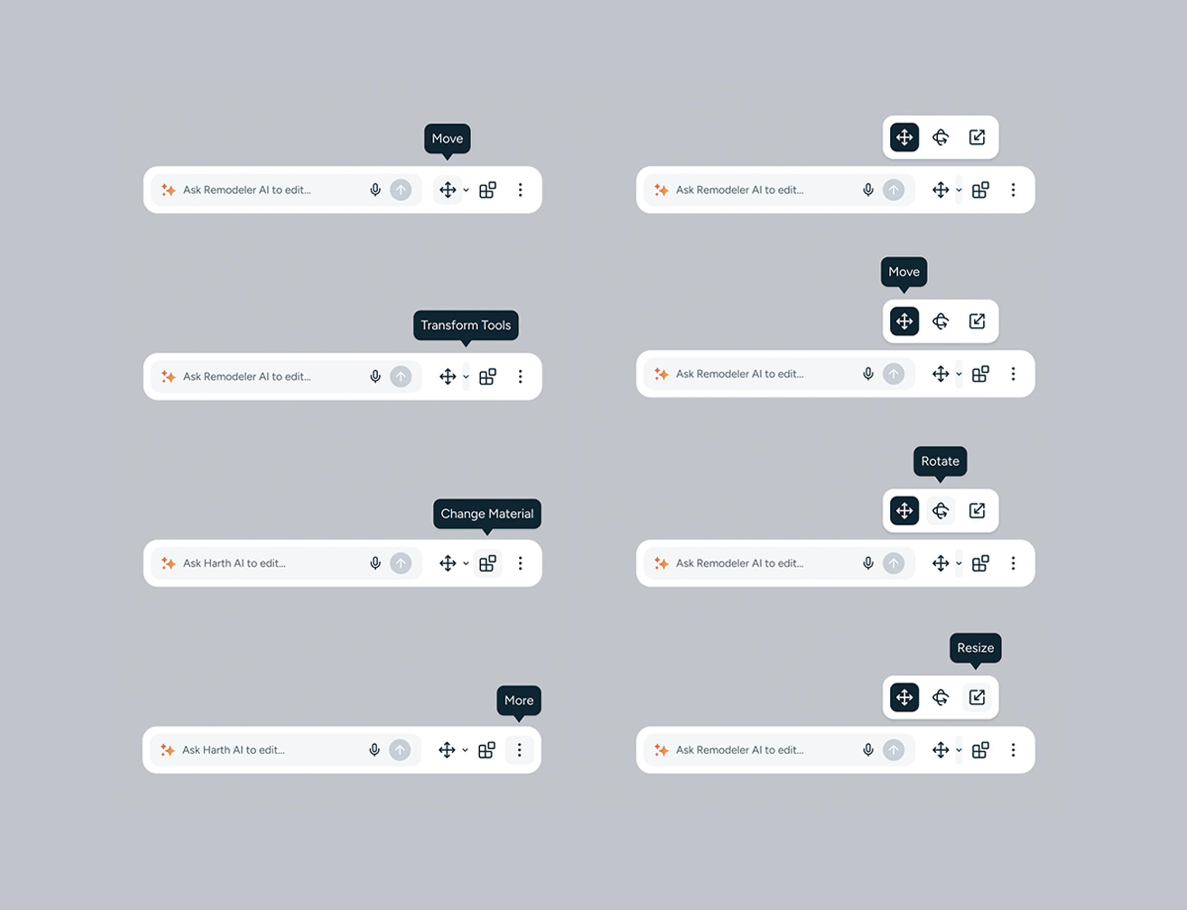 I consulted on product design for a confidential AI startup founded by a friend and former coworker. The platform enables anyone to update a 3D model using natural language AI commands.My work focused on designing 3D viewer toolbars that balanced AI-powered features with traditional and familiar design tools.